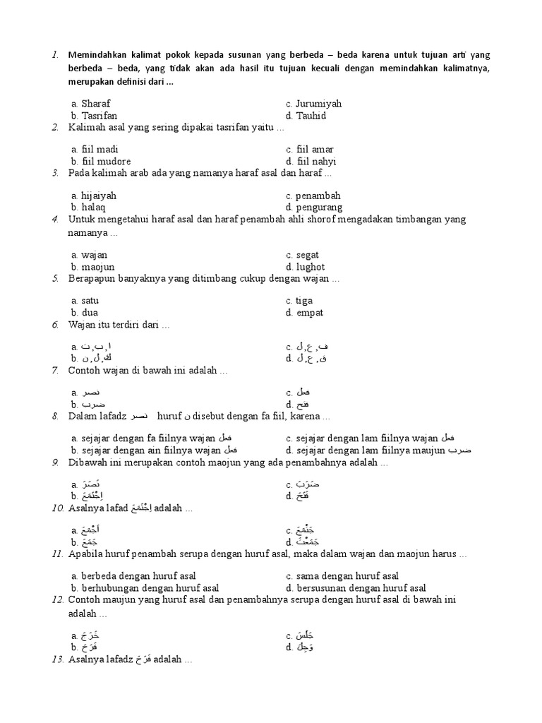 Soal Nahwu Shorof Kelas 11 Siswapelajar Com from imgv2-1-f.scribdassets.com Blog santri fasih mengaji kitab kuning. Sebutkan mana yang mu'rab dan mabniy dari kelompok: Soal dari no 25 sampai 28 lengkapilah tashrif fiil madhi berikut ini 25 25. اسلوبهم طرد فرض عدم بقاءك جوه. Tuliskan kelima sila dari pancasila! He served as minister of transportation from 2004 to 2005. Nahwu, balaghah, mu'jam, sharaf, kamus, terjemah dll. Simpansimpan soal nahwu sharaf 8 smt2 untuk nanti.